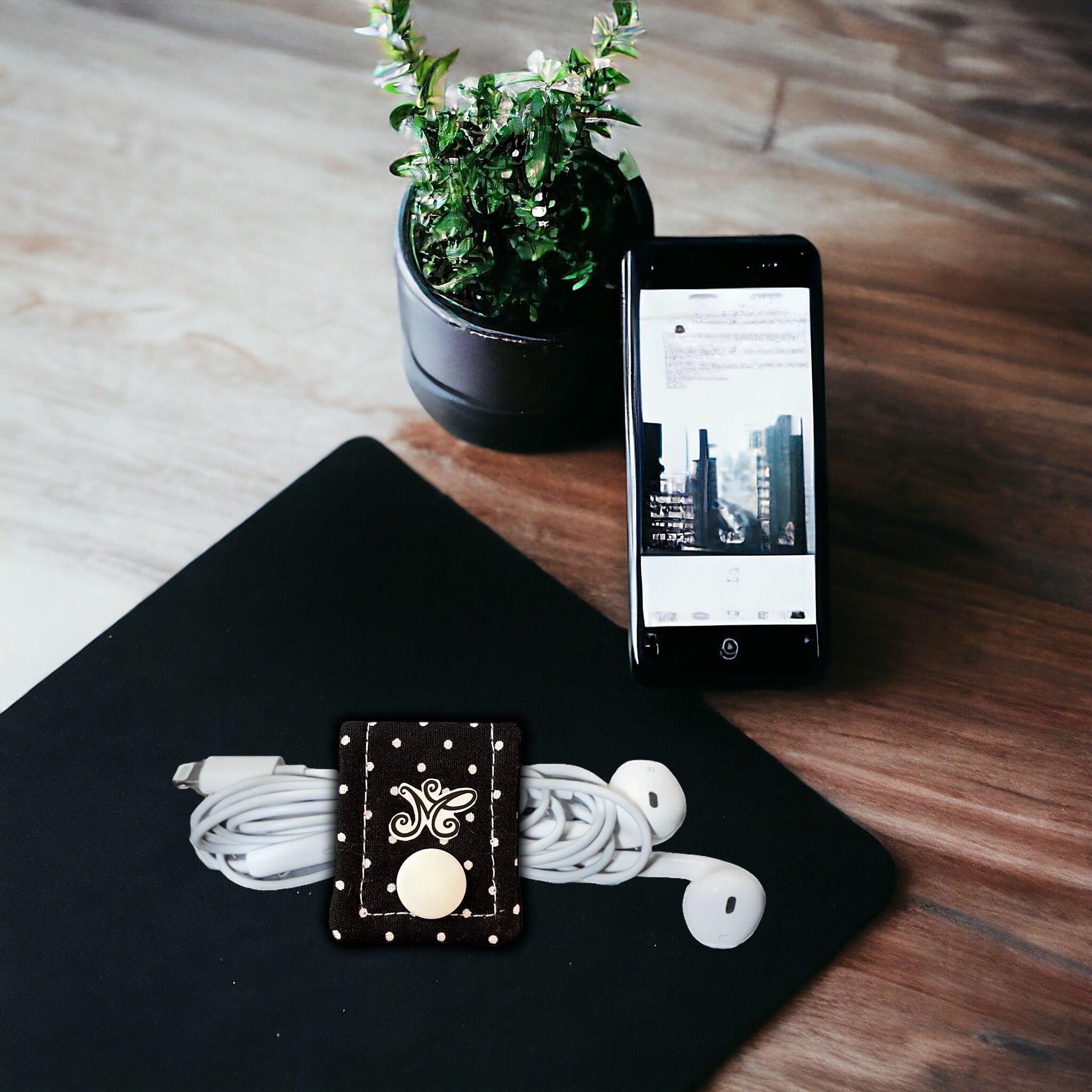 Ce lien en tissu coton décoratif, muni d'un bouton pression est une astuce pratique pour ranger les cordons de vos appareils tels que smartphones, tablettes et écouteurs.